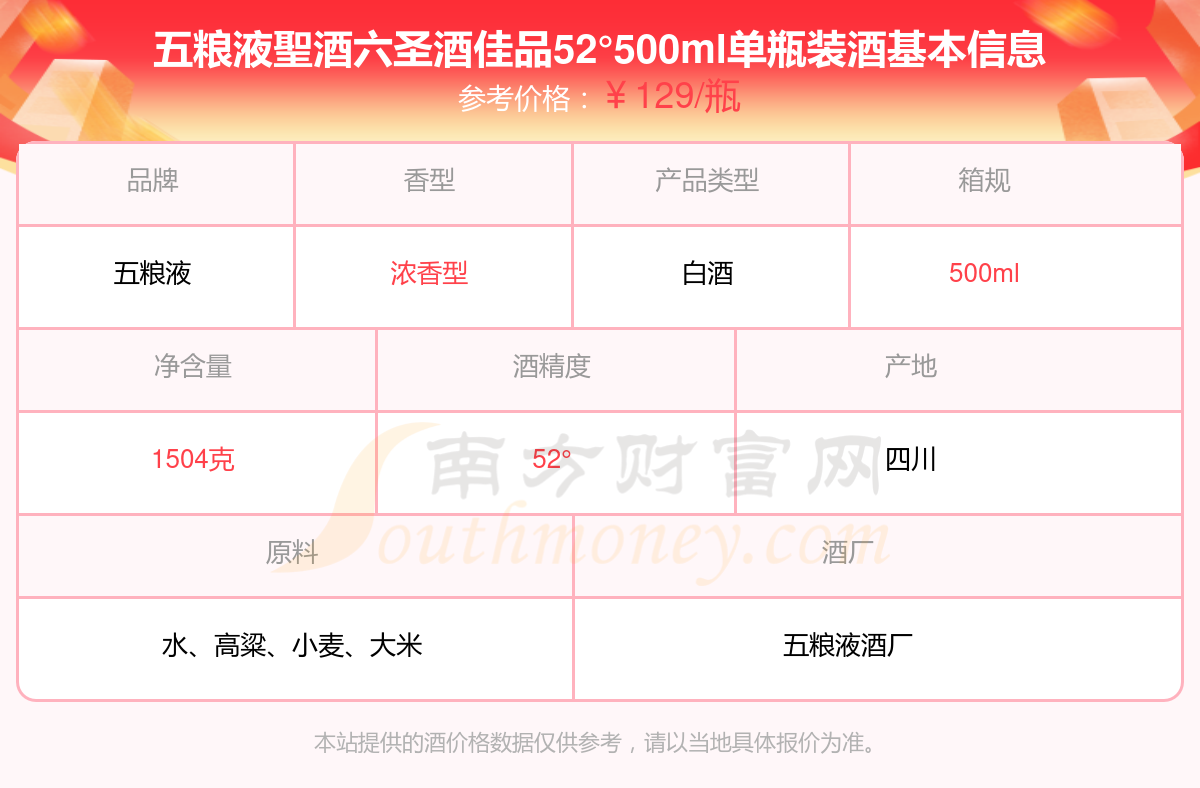 五糧液聖酒六圣酒佳品52°500ml單瓶裝基本信息