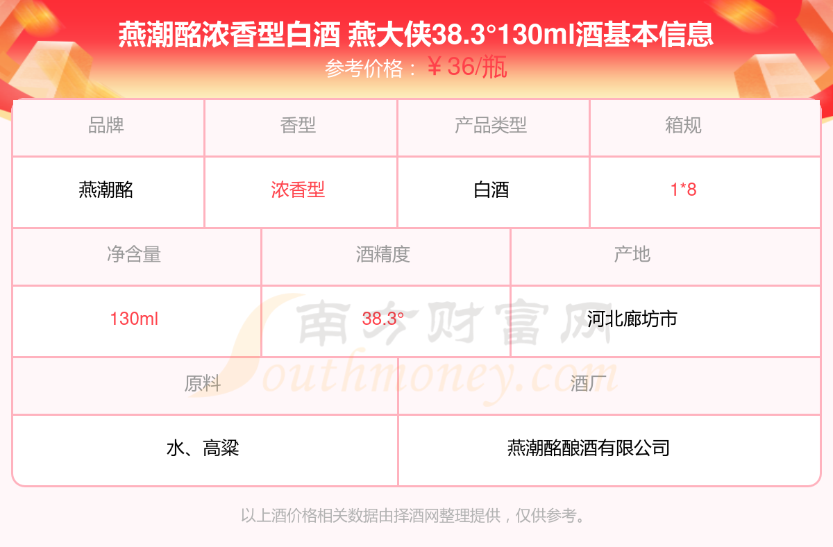 燕潮酩濃香型白酒 燕大俠38.3°130ml基本信息