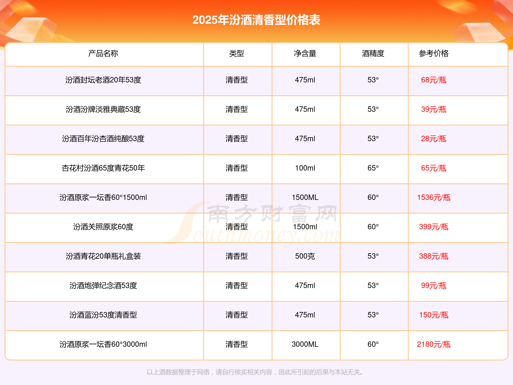 2025年,汾酒清香型酒價格最高的是汾酒原漿一壇香60°3000ml,參考價2180元,最低的是汾酒百年汾杏酒純釀53度,參考價28元,價格高低差為2152元。