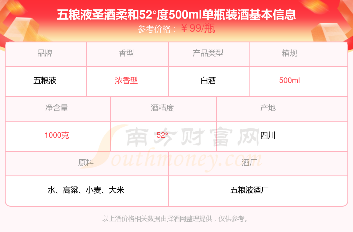 五糧液圣酒柔和52°度500ml單瓶裝基本信息