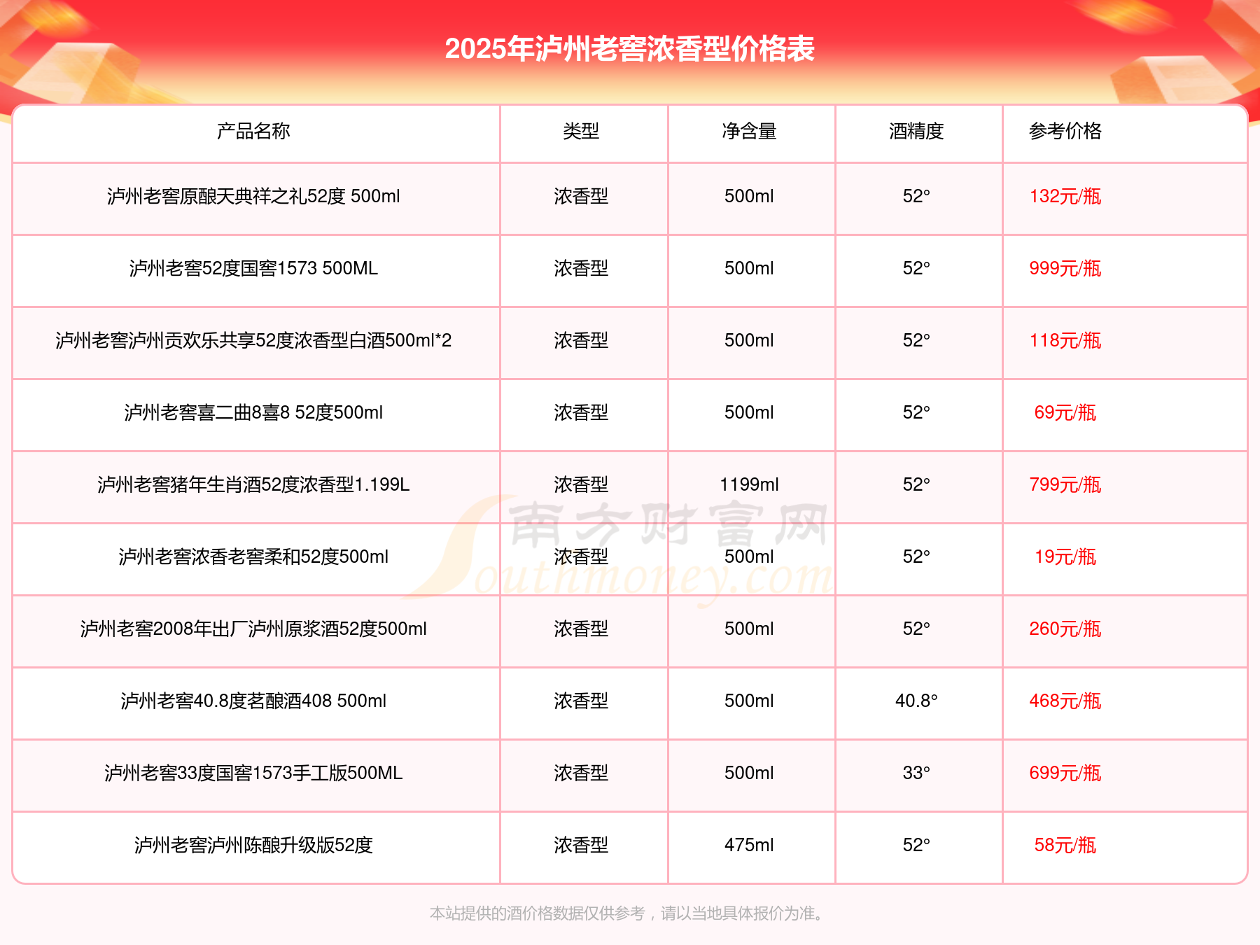 2025年,瀘州老窖國窖1573春釀鼠兆豐年E 55度、瀘州老窖國窖1573生命中的那壇酒55度014、瀘州老窖國窖1573春釀鼠兆豐年A 55度等瀘州老窖濃香型酒價(jià)格如下: