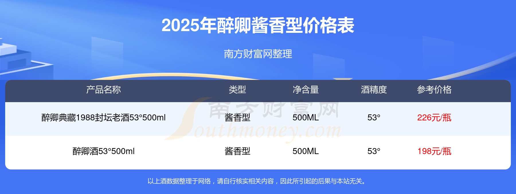 醉卿典藏1988封壇老酒53°500ml參考價(jià)226元/瓶、醉卿酒53°500ml參考價(jià)198元/瓶。