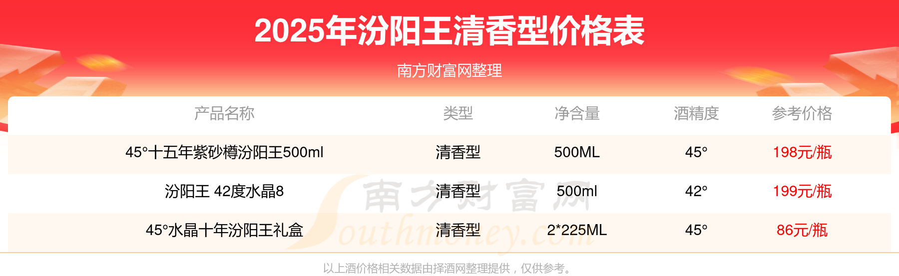 2025年,汾陽王 42度水晶8、45°十五年紫砂樽汾陽王500ml、45°水晶十年汾陽王禮盒等汾陽王清香型酒價格如下:汾陽王 42度水晶8參考價199元/瓶、45°十五年紫砂樽汾陽王500ml參考價198元/瓶、45°水晶十年汾陽王禮盒參考價86元/瓶。