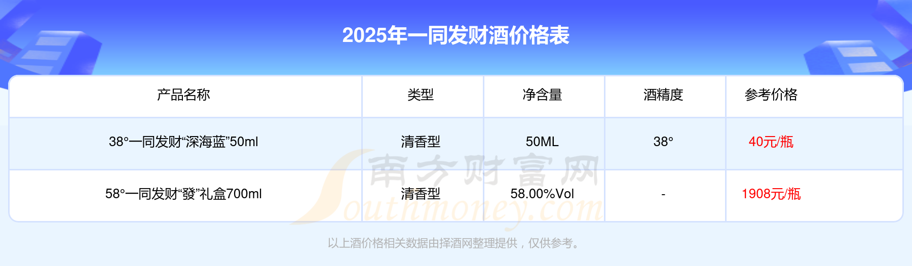 2025年,58°一同發(fā)財“發(fā)”禮盒700ml、38°一同發(fā)財“深海藍(lán)”50ml等一同發(fā)財酒價格如下:58°一同發(fā)財“發(fā)”禮盒700ml參考價1908元/瓶、38°一同發(fā)財“深海藍(lán)”50ml參考價40元/瓶。