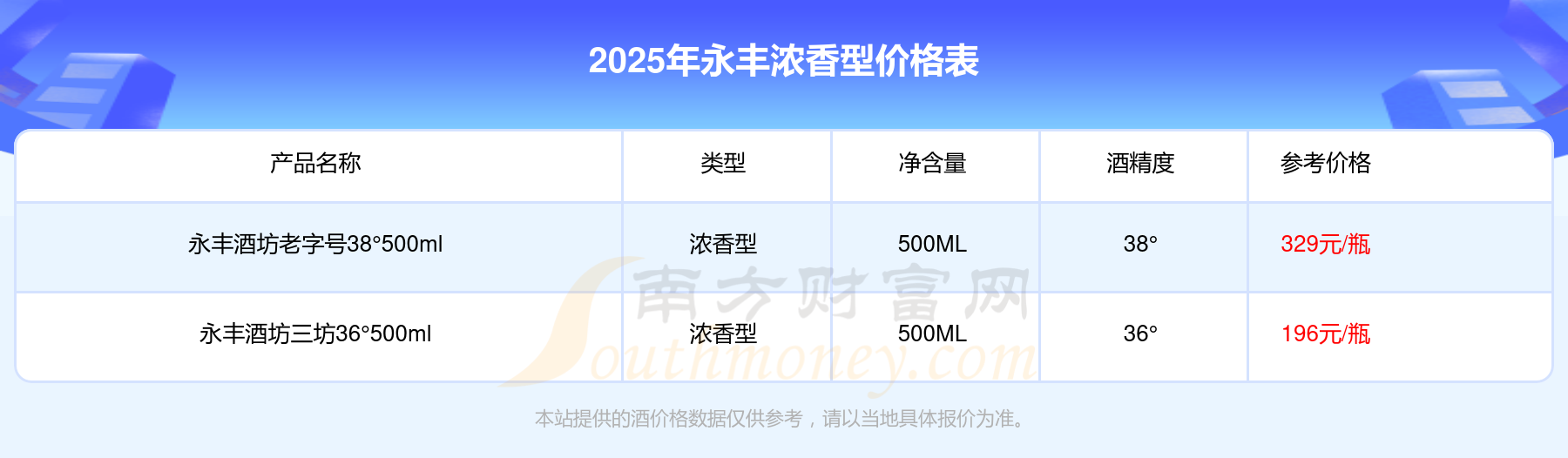 2025年永豐濃香型酒永豐酒坊老字號38°500ml、永豐酒坊三坊36°500ml等最新價格如下:
