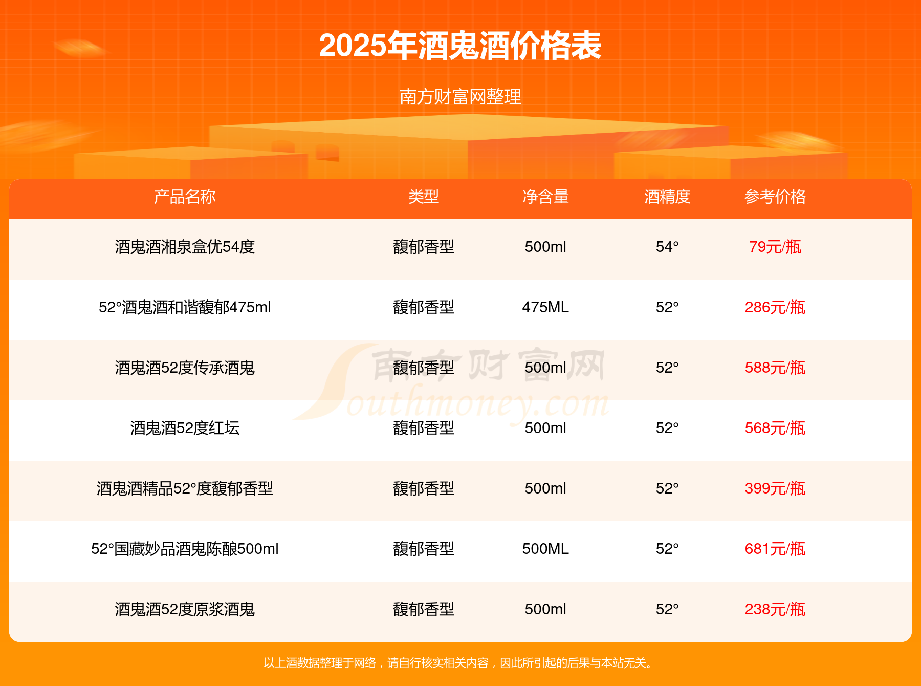 52°國藏妙品酒鬼陳釀500ml參考價681元/瓶、酒鬼酒52度傳承酒鬼參考價588元/瓶、酒鬼酒52度紅壇參考價568元/瓶、酒鬼酒精品52°度馥郁香型參考價399元/瓶、52°酒鬼酒和諧馥郁475ml參考價286元/瓶、酒鬼酒52度原漿酒鬼參考價238元/瓶、酒鬼酒湘泉盒優(yōu)54度參考價79元/瓶。