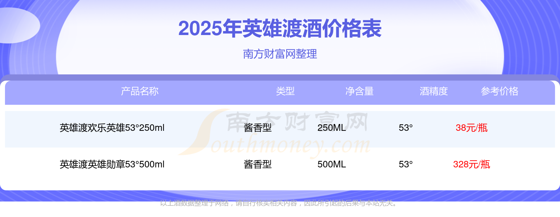 2025年英雄渡酒英雄渡英雄勛章53°500ml、英雄渡歡樂英雄53°250ml等最新價(jià)格如下:英雄渡英雄勛章53°500ml參考價(jià)328元/瓶、英雄渡歡樂英雄53°250ml參考價(jià)38元/瓶。