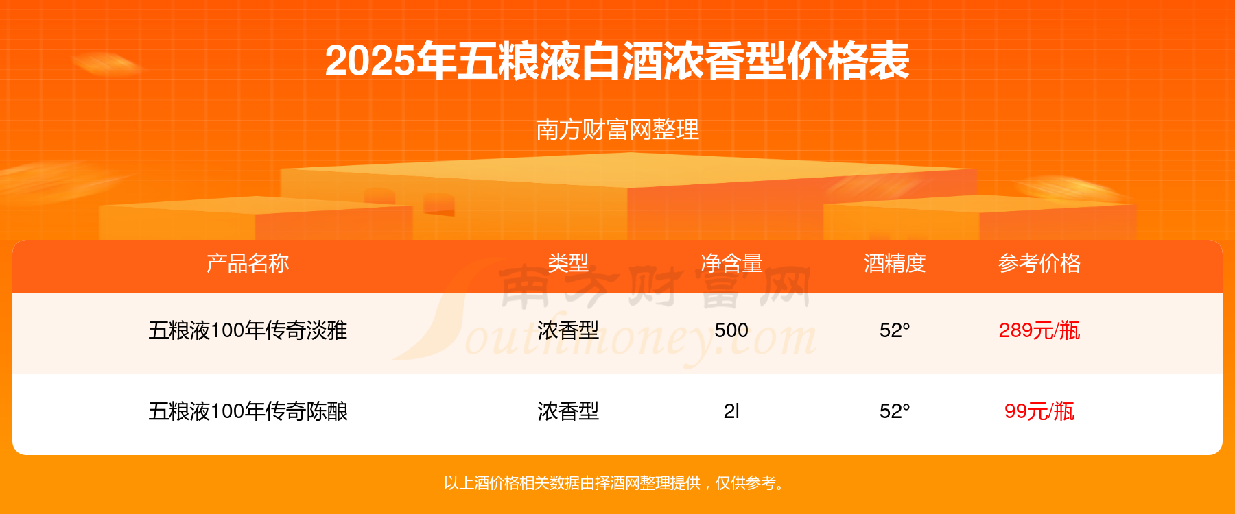 2025年五糧液白酒濃香型酒五糧液100年傳奇淡雅、五糧液100年傳奇陳釀等最新價(jià)格如下:五糧液100年傳奇淡雅參考價(jià)289元/瓶、五糧液100年傳奇陳釀參考價(jià)99元/瓶。