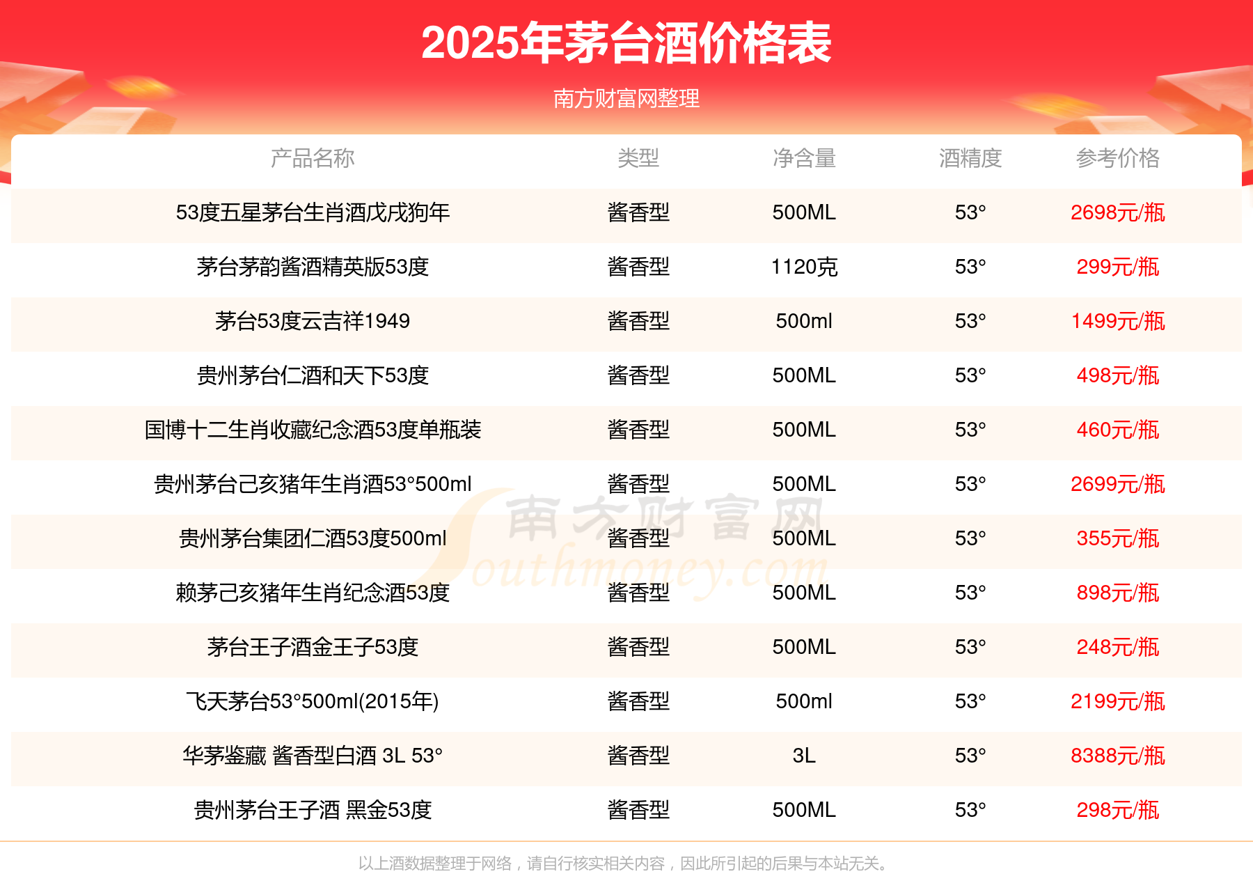 2025年,華茅鑒藏 醬香型白酒 3L 53°、53度五星茅臺(tái)生肖酒丁酉雞年、貴州茅臺(tái)己亥豬年生肖酒53°500ml、53度五星茅臺(tái)生肖酒戊戌狗年、飛天茅臺(tái)53°500ml(2015年)、茅臺(tái)王子酒己亥豬年生肖紀(jì)念酒53度2.5L、茅臺(tái)1935醬香型53度等茅臺(tái)酒參考價(jià)格如下:華茅鑒藏 醬香型白酒 3L 53°參考價(jià)8388元、53度五星茅臺(tái)生肖酒丁酉雞年參考價(jià)2798元、貴州茅臺(tái)己亥豬年生肖酒53°500ml參考價(jià)2699元、53度五星茅臺(tái)生肖酒戊戌狗年參考價(jià)2698元、飛天茅臺(tái)53°500ml(2015年)參考價(jià)2199元、茅臺(tái)王子酒己亥豬年生肖紀(jì)念酒53度2.5L參考價(jià)2099元、茅臺(tái)1935醬香型53度參考價(jià)1799元。