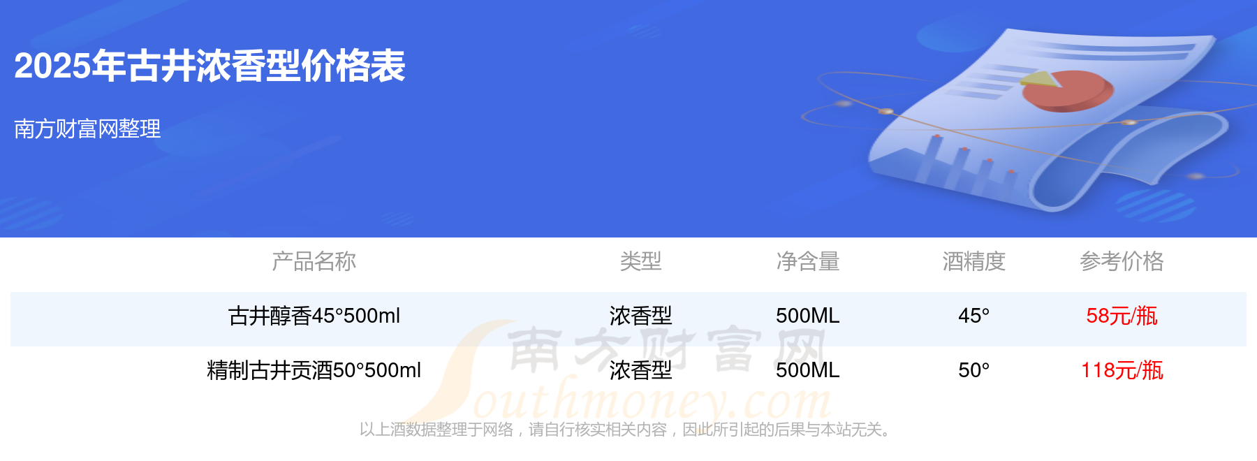 2025年,精制古井貢酒50°500ml、古井醇香45°500ml等古井濃香型酒價格如下:精制古井貢酒50°500ml參考價118元/瓶、古井醇香45°500ml參考價58元/瓶。
