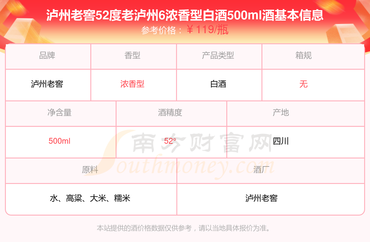 瀘州老窖52度老瀘州6濃香型白酒500ml基本信息