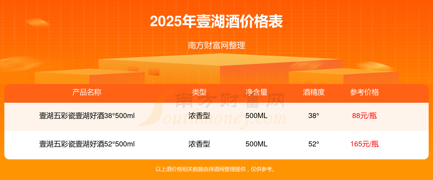 壹湖酒最新價格2025:壹湖五彩瓷壹湖好酒52°500ml參考價165元/瓶、壹湖五彩瓷壹湖好酒38°500ml參考價88元/瓶。