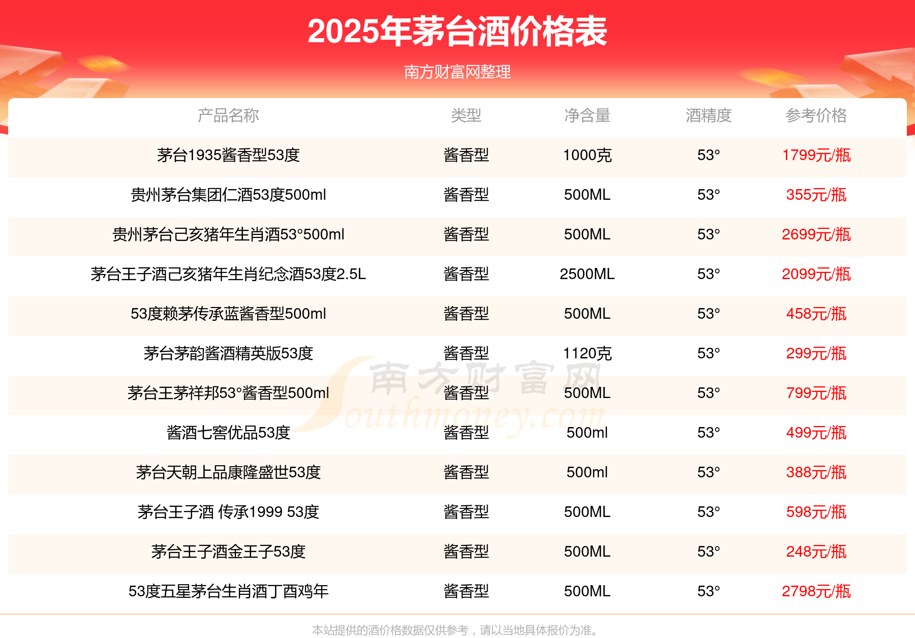 2025年茅臺(tái)酒華茅鑒藏 醬香型白酒 3L 53°、53度五星茅臺(tái)生肖酒丁酉雞年、貴州茅臺(tái)己亥豬年生肖酒53°500ml、53度五星茅臺(tái)生肖酒戊戌狗年、飛天茅臺(tái)53°500ml(2015年)等最新價(jià)格如下: