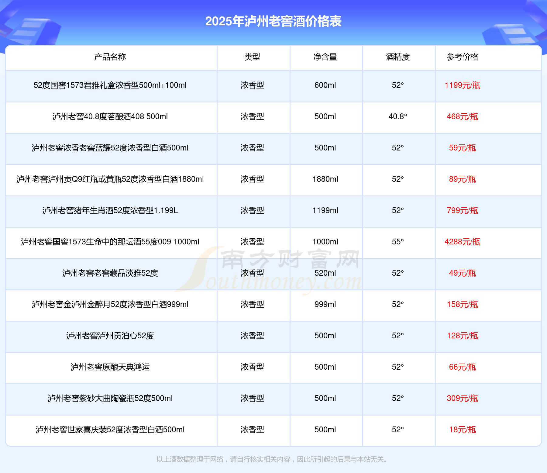 2025年,瀘州老窖國窖1573春釀鼠兆豐年E 55度、瀘州老窖國窖1573生命中的那壇酒55度014、瀘州老窖國窖1573春釀鼠兆豐年A 55度、瀘州老窖國窖1573生命中的那壇酒55度013濃香型白酒1000ml、瀘州老窖國窖1573生命中的那壇酒55度009 1000ml、瀘州老窖國窖1573中國品味52度濃香型白酒500ml、瀘州老窖國窖1573許燎源概念作品58度濃香型白酒1000ml、瀘州老窖52度國窖1573狗年生肖禮盒等瀘州老窖酒價格如下:瀘州老窖國窖1573春釀鼠兆豐年E 55度參考價17999元/瓶、瀘州老窖國窖1573生命中的那壇酒55度014參考價9999元/瓶、瀘州老窖國窖1573春釀鼠兆豐年A 55度參考價5088元/瓶、瀘州老窖國窖1573生命中的那壇酒55度013濃香型白酒1000ml參考價4988元/瓶、瀘州老窖國窖1573生命中的那壇酒55度009 1000ml參考價4288元/瓶、瀘州老窖國窖1573中國品味52度濃香型白酒500ml參考價2888元/瓶、瀘州老窖國窖1573許燎源概念作品58度濃香型白酒1000ml參考價2680元/瓶、瀘州老窖52度國窖1573狗年生肖禮盒參考價2143元/瓶。