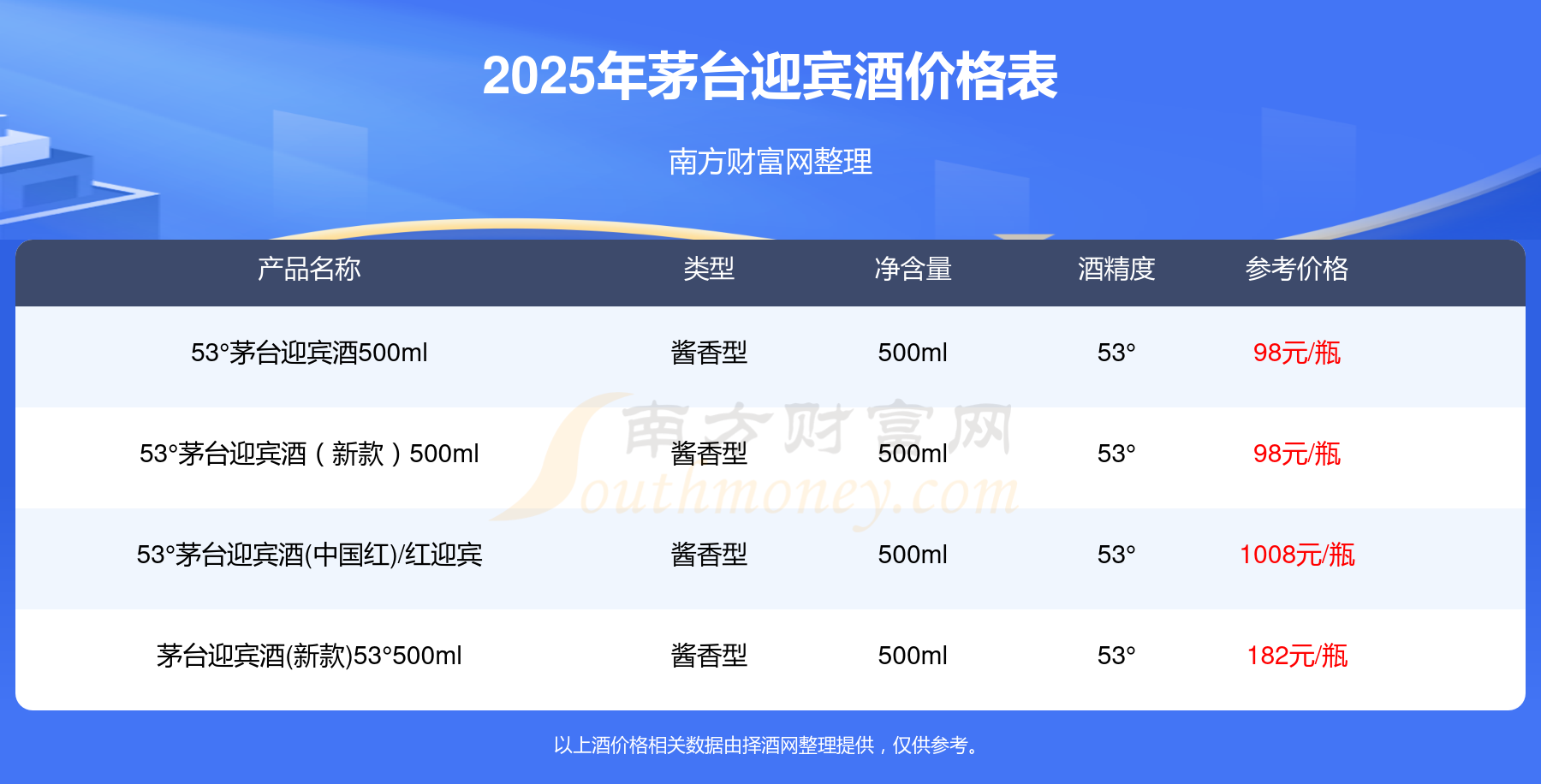 53°茅臺迎賓酒(中國紅)/紅迎賓參考價1008元/瓶、茅臺迎賓酒(新款)53°500ml參考價182元/瓶、53°茅臺迎賓酒(新款)500ml參考價98元/瓶、53°茅臺迎賓酒500ml參考價98元/瓶。