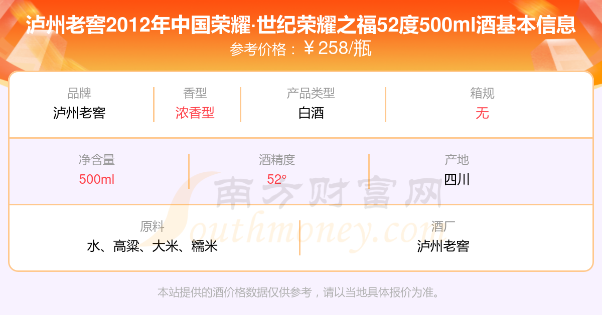 瀘州老窖2012年中國榮耀·世紀(jì)榮耀之福52度500ml基本信息