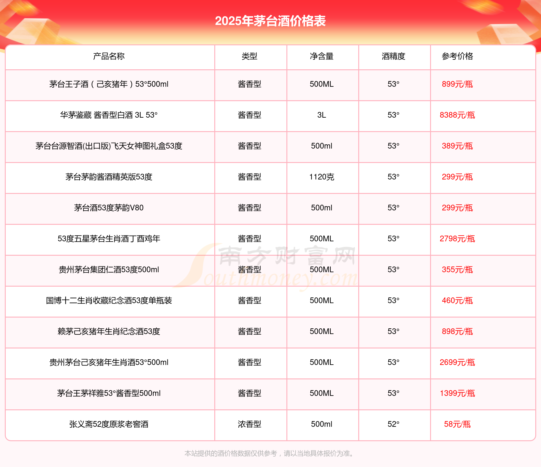 2025年茅臺酒華茅鑒藏 醬香型白酒 3L 53°、53度五星茅臺生肖酒丁酉雞年、貴州茅臺己亥豬年生肖酒53°500ml、53度五星茅臺生肖酒戊戌狗年、飛天茅臺53°500ml(2015年)、茅臺王子酒己亥豬年生肖紀(jì)念酒53度2.5L等最新價格如下: