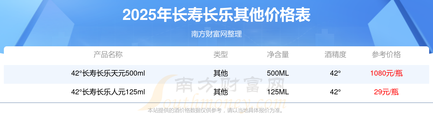 42°長壽長樂天元500ml參考價1080元/瓶、42°長壽長樂人元125ml參考價29元/瓶。