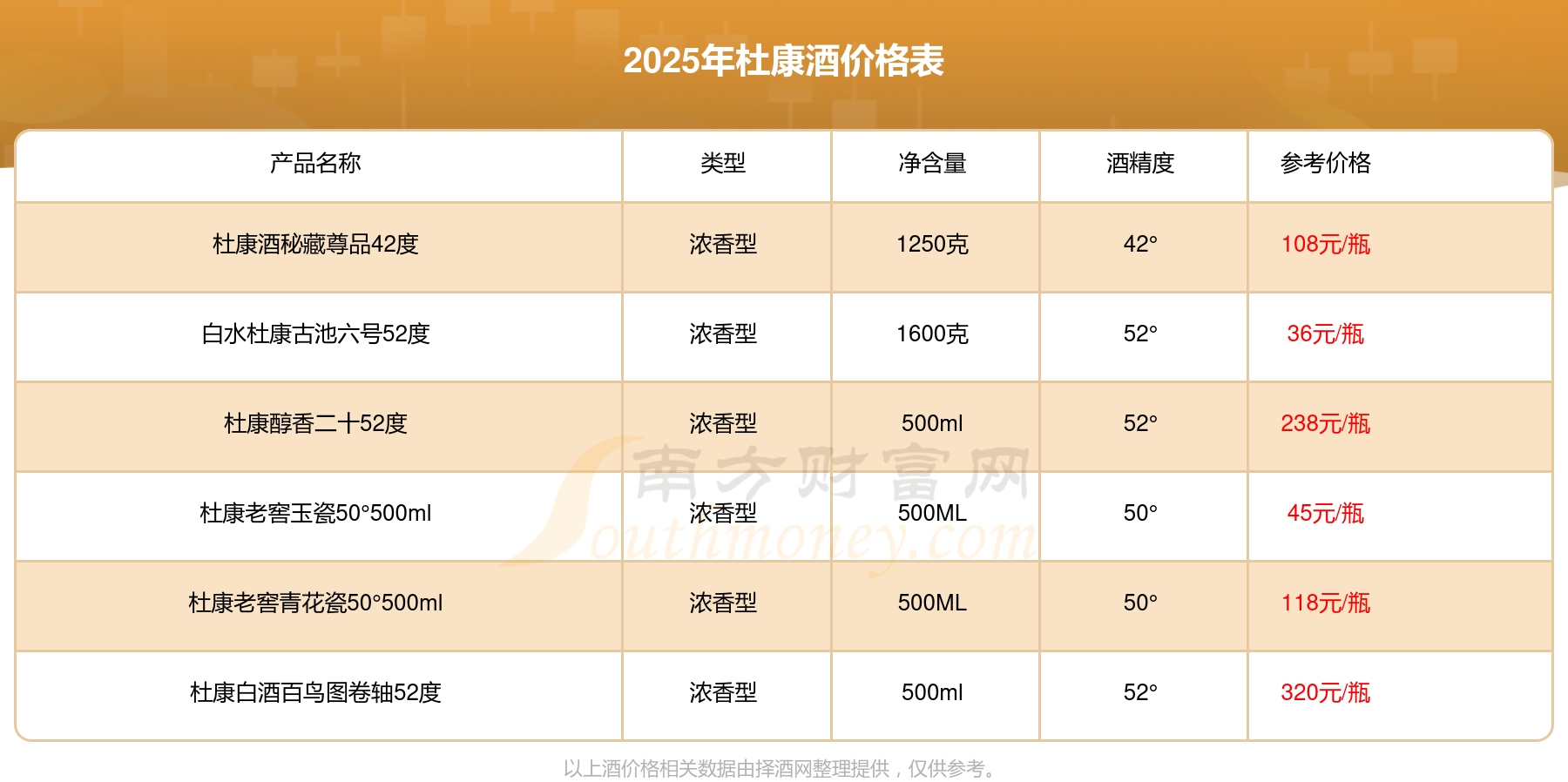 2025杜康酒最新價格:杜康白酒百鳥圖卷軸52度參考價320元/瓶、杜康醇香二十52度參考價238元/瓶、杜康老窖青花瓷50°500ml參考價118元/瓶、杜康酒秘藏尊品42度參考價108元/瓶、杜康老窖玉瓷50°500ml參考價45元/瓶、白水杜康古池六號52度參考價36元/瓶。