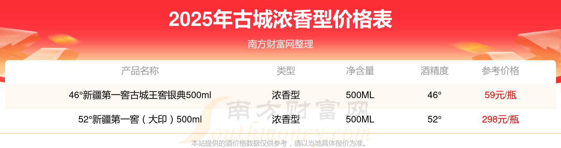 52°新疆第一窖(大。500ml參考價(jià)298元/瓶、46°新疆第一窖古城王窖銀典500ml參考價(jià)59元/瓶。