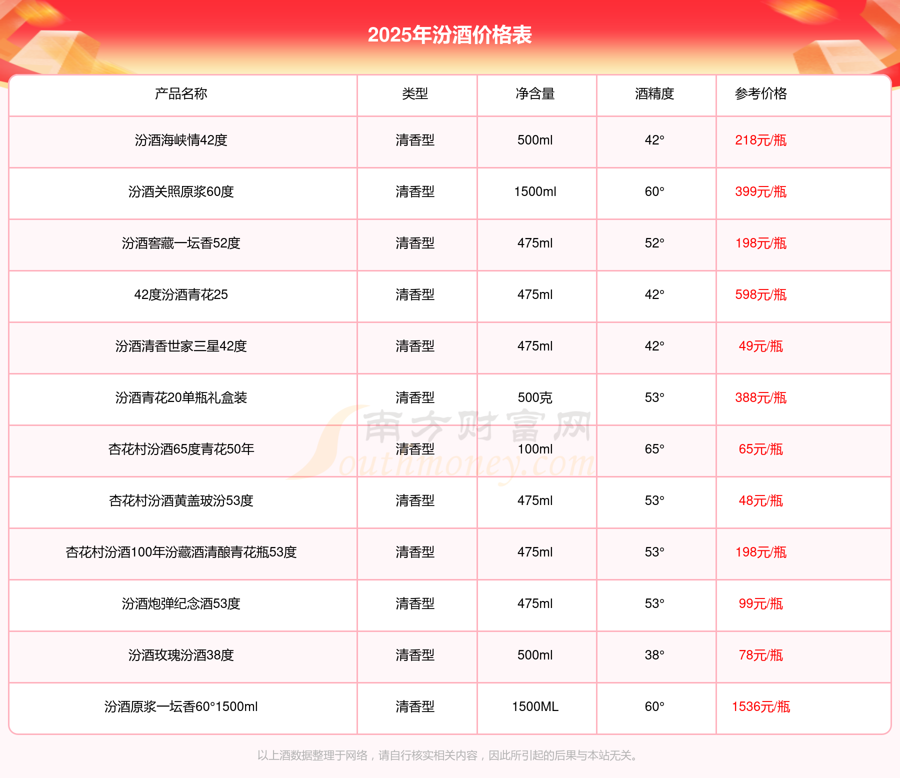 2025年,汾酒價(jià)格最高的是汾酒原漿一壇香60°3000ml,參考價(jià)2180元,最低的是汾酒百年汾杏酒純釀53度,參考價(jià)28元,價(jià)格高低差為2152元。