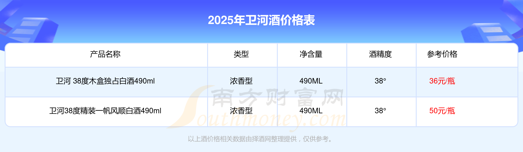 2025年,衛(wèi)河38度精裝一帆風(fēng)順白酒490ml、衛(wèi)河 38度木盒獨(dú)占白酒490ml等衛(wèi)河酒價(jià)格如下: