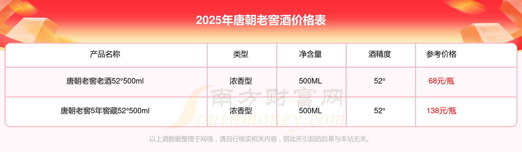 2025年唐朝老窖酒唐朝老窖5年窖藏52°500ml、唐朝老窖老酒52°500ml等最新價格如下:唐朝老窖5年窖藏52°500ml參考價138元/瓶、唐朝老窖老酒52°500ml參考價68元/瓶。