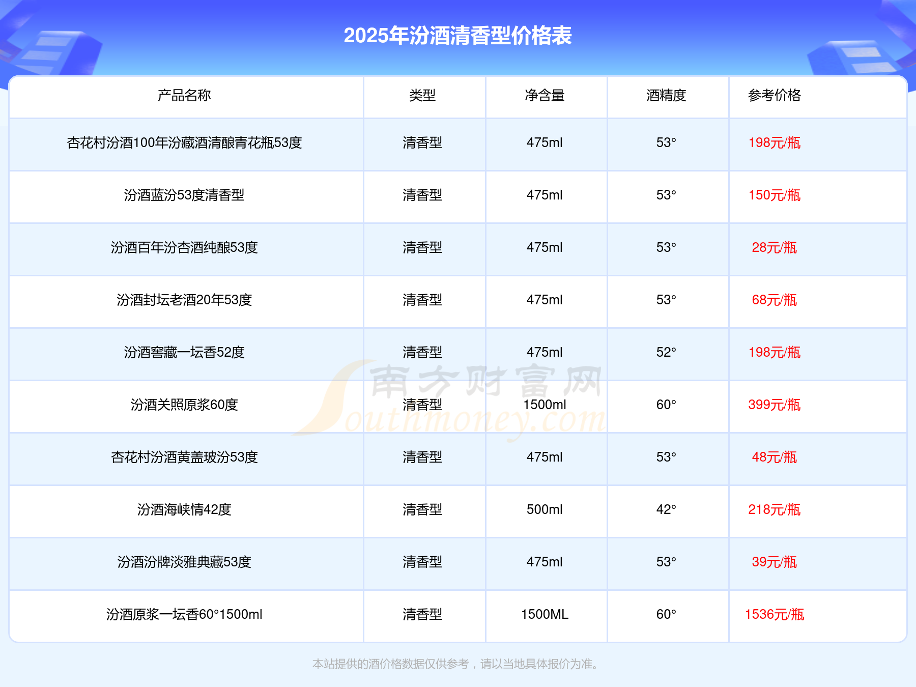 2025年,汾酒清香型酒價格最高的是汾酒原漿一壇香60°3000ml,參考價2180元,最低的是汾酒百年汾杏酒純釀53度,參考價28元,價格高低差為2152元。