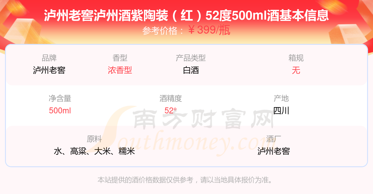 瀘州老窖瀘州酒紫陶裝(紅)52度500ml基本信息