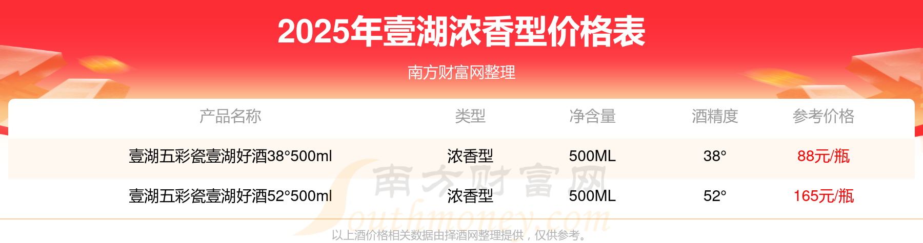 2025年,壹湖濃香型酒價格最高的是壹湖五彩瓷壹湖好酒52°500ml,參考價165元,最低的是壹湖五彩瓷壹湖好酒38°500ml,參考價88元,價格高低差為77元。