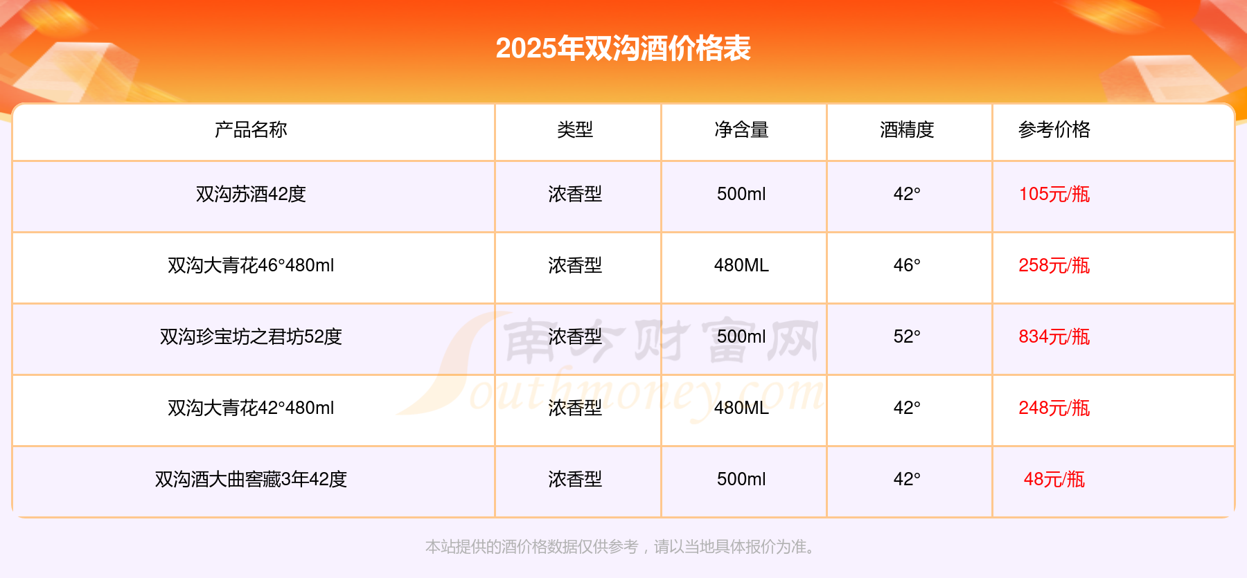 2025年,雙溝珍寶坊之君坊52度、雙溝大青花46°480ml、雙溝大青花42°480ml等雙溝酒價格如下:雙溝珍寶坊之君坊52度參考價834元/瓶、雙溝大青花46°480ml參考價258元/瓶、雙溝大青花42°480ml參考價248元/瓶。