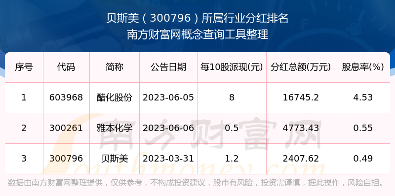 按照南方財(cái)富網(wǎng)趨勢(shì)選股系統(tǒng)統(tǒng)計(jì),貝斯美所屬行業(yè)為二甲戊靈行業(yè),二甲戊靈行業(yè)分紅排名情況如下表:
