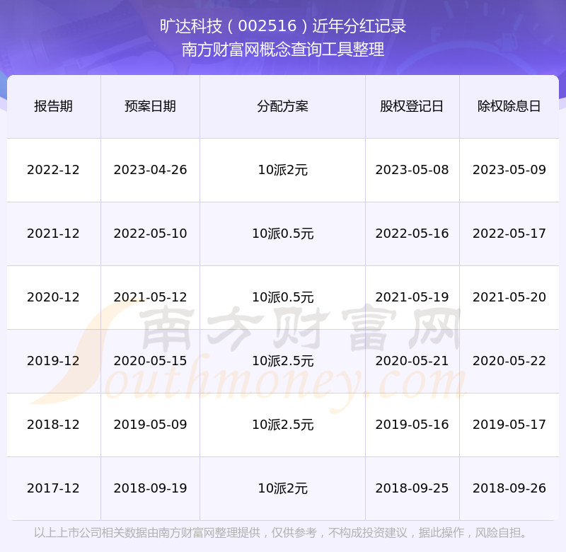 一、曠達(dá)科技(002516)股票分紅記錄