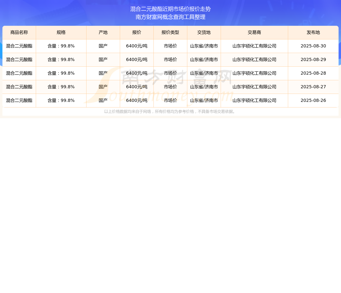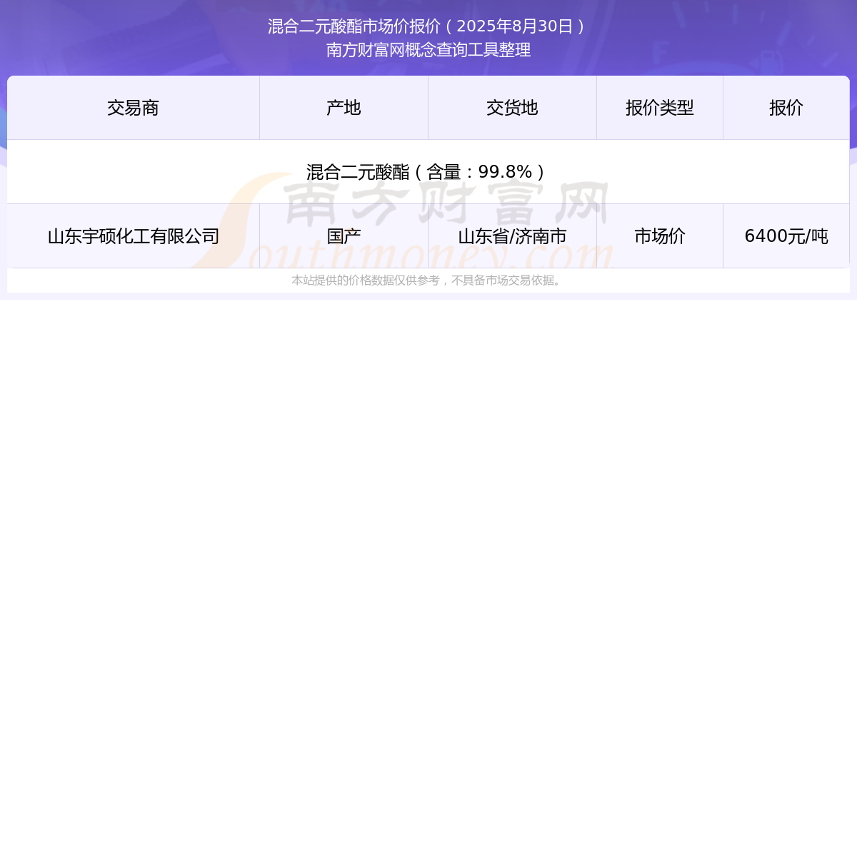 2025年8月30日,山東宇碩化工有限公司混合二元酸酯(含量:99.8%),國產(chǎn),交易地點為山東省/濟南市,市場價報價為6400.00元/噸。