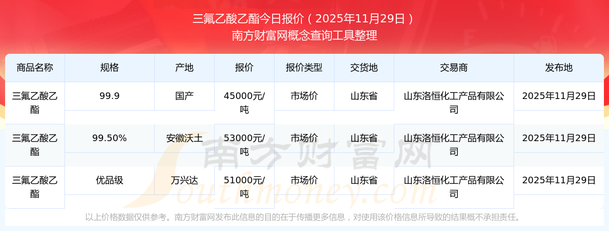 2025年11月29日,三氟乙酸乙酯(99.9)市場價(jià)價(jià)格為45000.00元/噸,報(bào)價(jià)人:山東洛恒化工產(chǎn)品有限公司,交易地點(diǎn)為山東省。