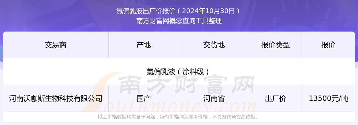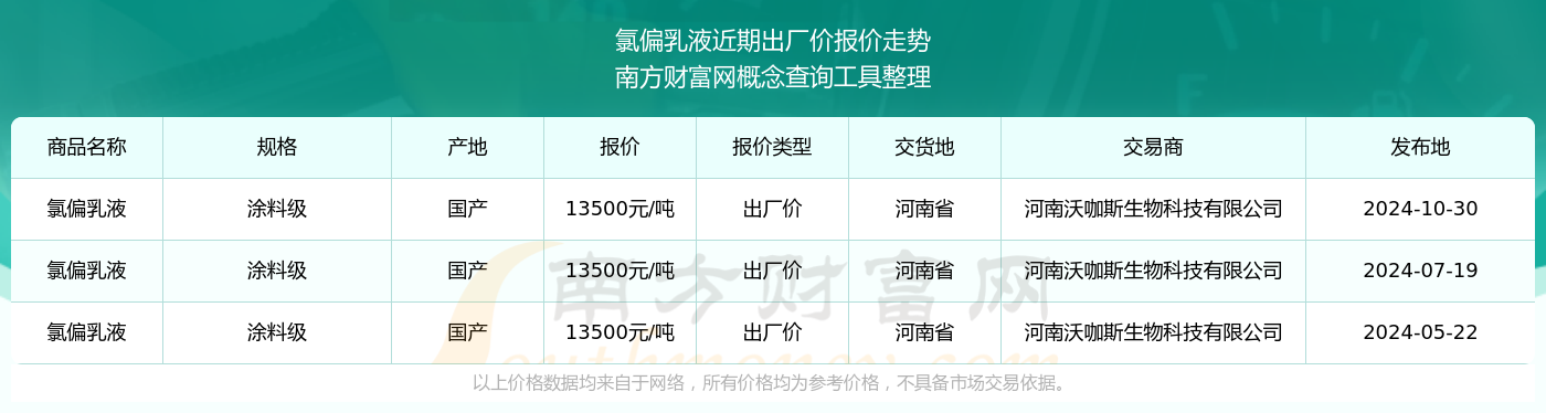 2024年10月30日,氯偏乳液(涂料級)出廠價價格為13500.00元/噸,報價人:河南沃咖斯生物科技有限公司,交易地點為河南省。