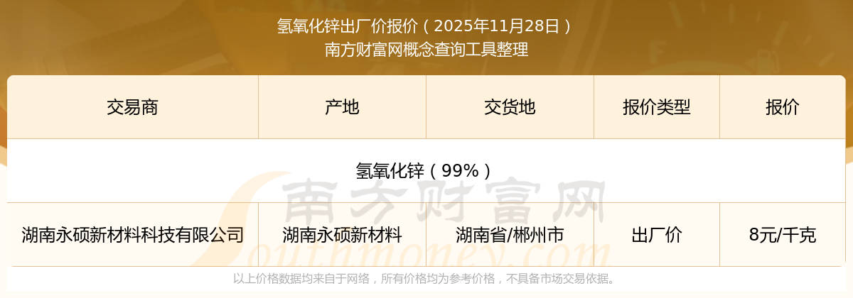2025年11月28日,湖南永碩新材料科技有限公司氫氧化鋅(99%),湖南永碩新材料,交易地點(diǎn)為湖南省/郴州市,出廠價(jià)報(bào)價(jià)為8.00元/千克。