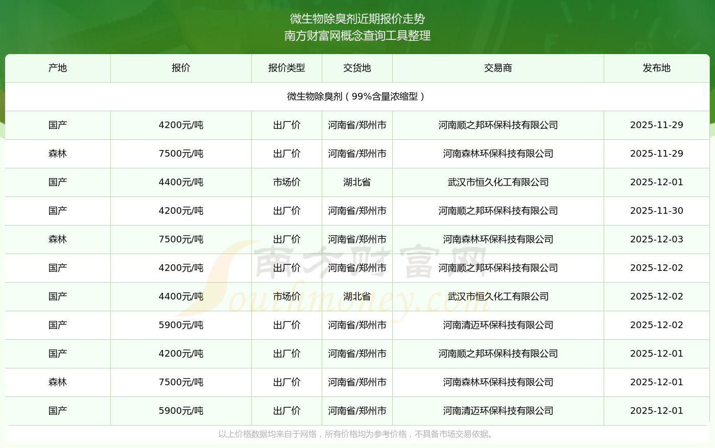 2025年12月3日,微生物除臭劑(99%含量濃縮型)價(jià)格為7500.00元/噸,報(bào)價(jià)人:河南森林環(huán)?萍加邢薰,交易地點(diǎn)為河南省/鄭州市。