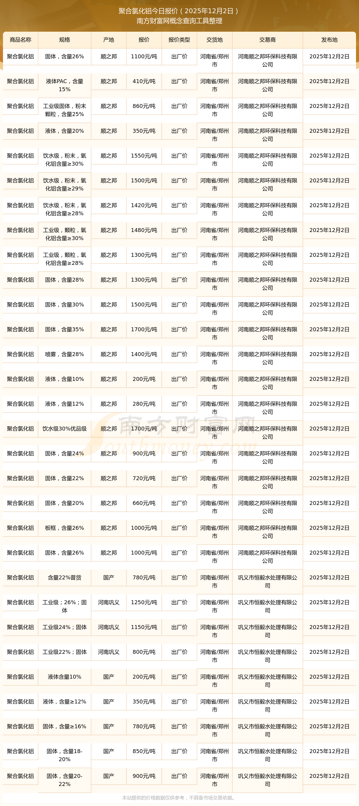 2025年12月2日,聚合氯化鋁(液體PAC,含量15%)價格為410.00元/噸,報價人:河南順之邦環(huán)?萍加邢薰荆灰椎攸c為河南省/鄭州市。