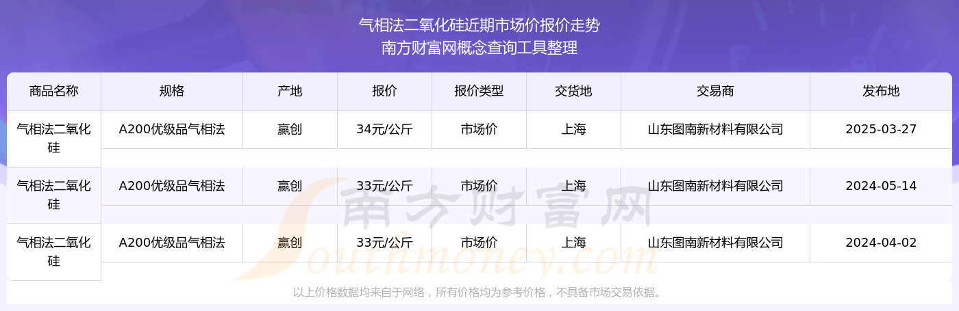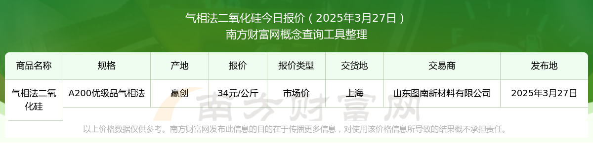 2025年3月27日,氣相法二氧化硅(A200優(yōu)級品氣相法)市場價價格為34.00元/公斤,報價人:山東圖南新材料有限公司,交易地點為上海。