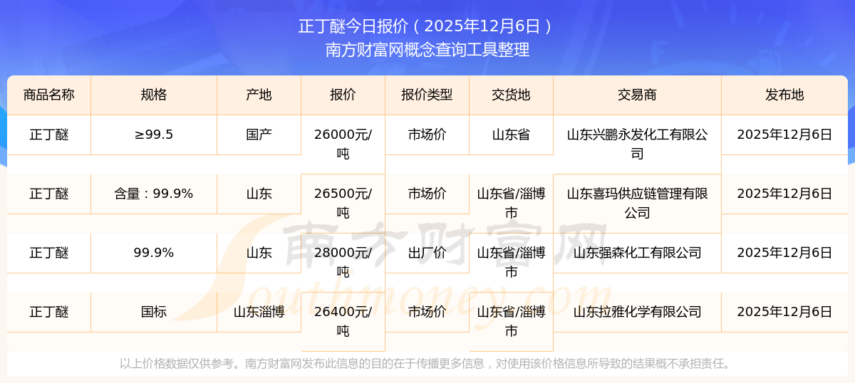 2025年12月6日,正丁醚(99.9%)價(jià)格為28000.00元/噸,報(bào)價(jià)人:山東強(qiáng)森化工有限公司,交易地點(diǎn)為山東省/淄博市。