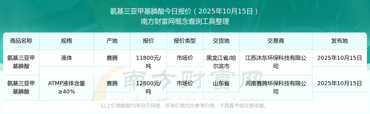 2025年10月15日,氨基三亞甲基膦酸(ATMP液體含量≥40%)市場價(jià)價(jià)格為12800.00元/噸,報(bào)價(jià)人:河南賽騰環(huán)保科技有限公司,交易地點(diǎn)為山東省。