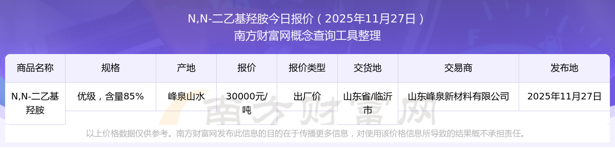 2025年11月27日,N,N-二乙基羥胺(優(yōu)級(jí),含量85%)價(jià)格為30000.00元/噸,報(bào)價(jià)人:山東峰泉新材料有限公司,交易地點(diǎn)為山東省/臨沂市。