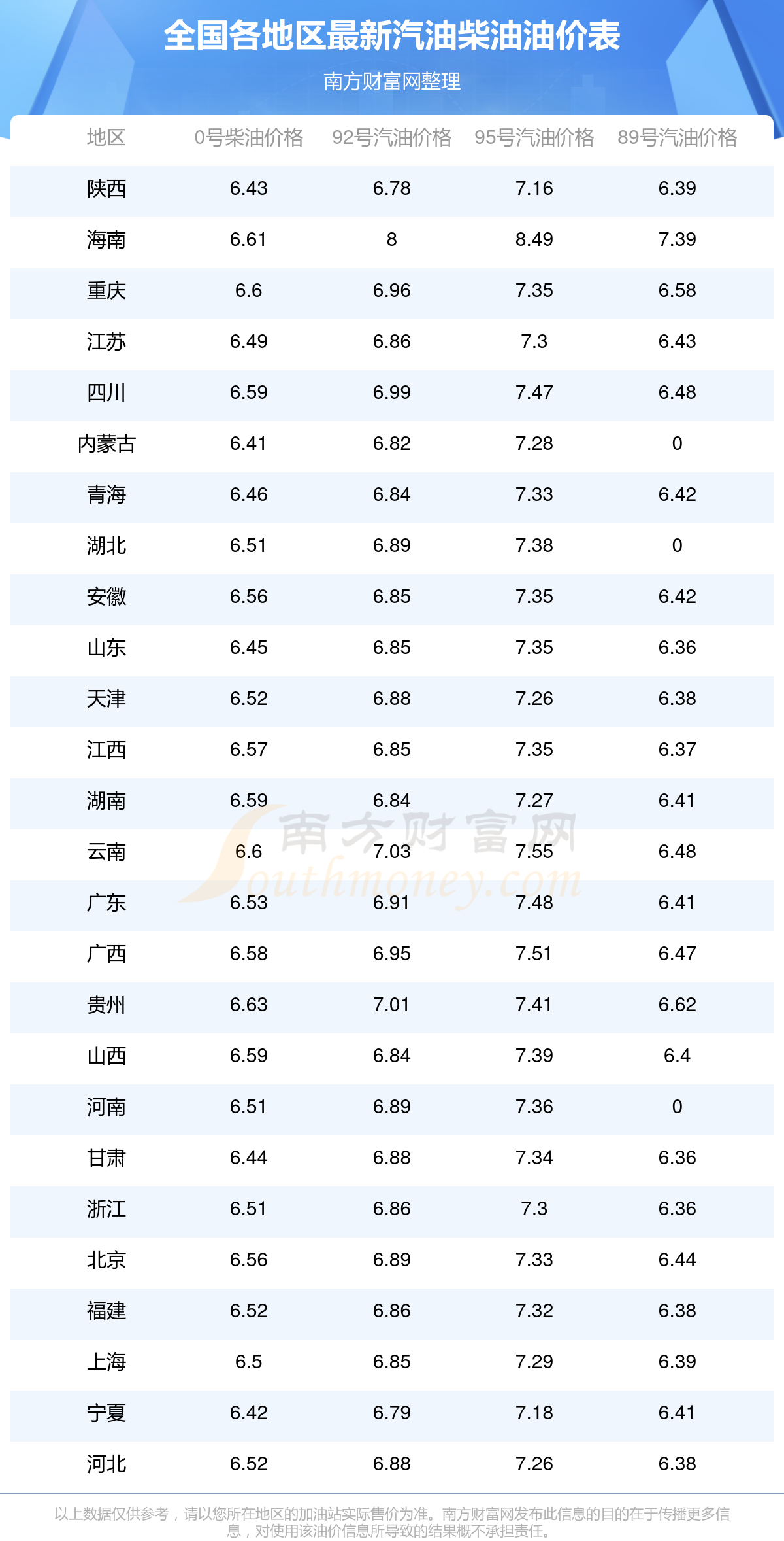 油價(jià)數(shù)據(jù)僅供參考,請(qǐng)以您所在地區(qū)的加油站報(bào)價(jià)為準(zhǔn)。南方財(cái)富網(wǎng)發(fā)布此信息的目的在于傳播更多信息,對(duì)使用該油價(jià)信息所導(dǎo)致的結(jié)果概不承擔(dān)任何責(zé)任。