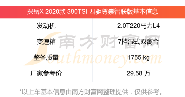 探岳X 2020款 380TSI 四驅(qū)尊崇智聯(lián)版搭載了一臺2.0T220馬力L4渦輪增壓發(fā)動(dòng)機(jī),采用7擋濕式雙離合自動(dòng)檔變速箱,常規(guī)整備質(zhì)量1755kg,廠家參考價(jià)29.58萬元。