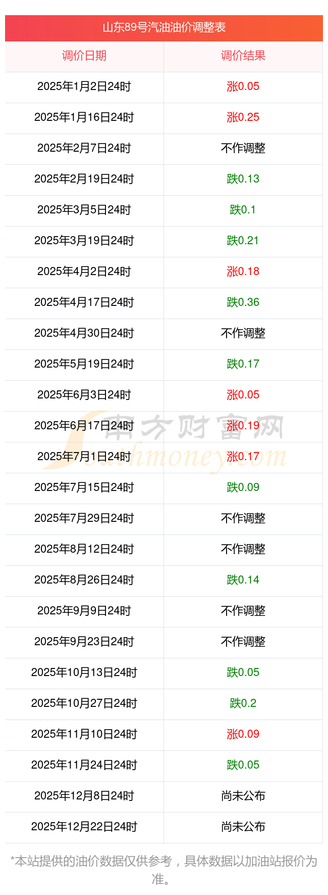 12月2日,山東89號汽油的價格是6.36元每升,本次的調(diào)整時間為11月25日,對比上次的調(diào)整跌了0.05元,跌0.78%,12月8日24時為下一輪油價調(diào)整時間,還有6.22天。