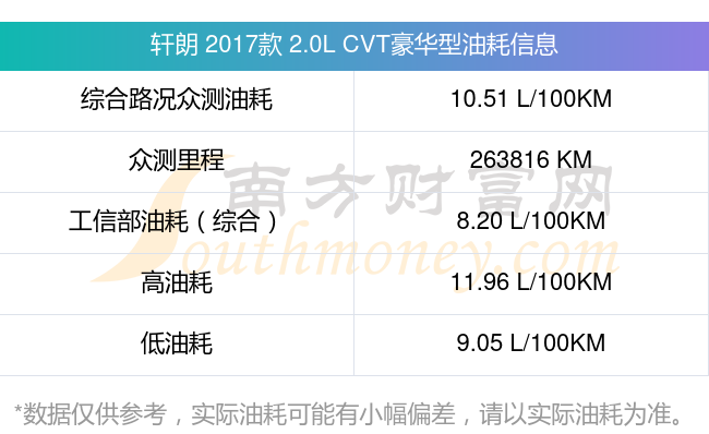 根據(jù)多位車主實(shí)測(cè)得出數(shù)據(jù),該車型低油耗為9.05升/百公里,高油耗為11.96升/百公里,綜合路況眾測(cè)油耗為10.51升/百公里,工信部綜合油耗為8.20升/百公里。