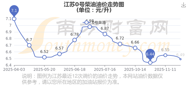 12月2日,江蘇0號柴油的價(jià)格是6.49元每升,本次的調(diào)整時(shí)間為11月25日,對比上次的調(diào)整下調(diào)了0.06元,下調(diào)0.916%,12月8日24時(shí)為下一輪油價(jià)調(diào)整時(shí)間,還有6.19天。
