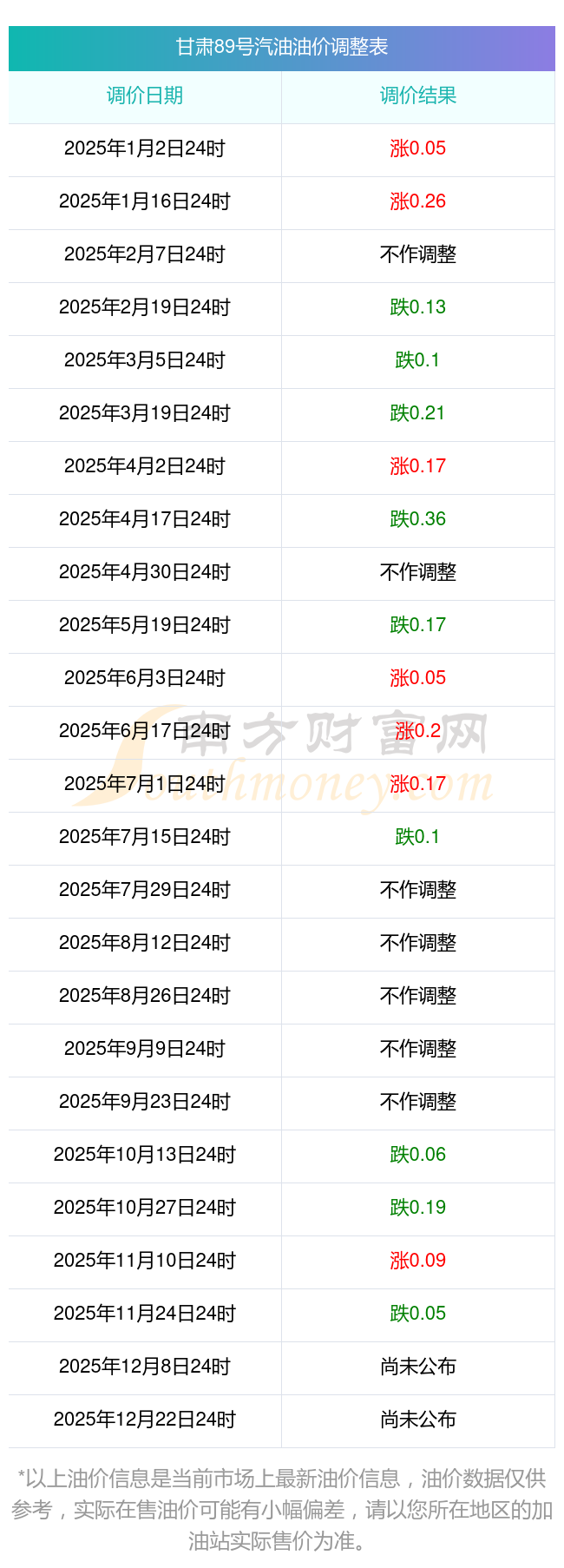 12月2日,甘肅汽油、柴油每升的價格為:92號汽油6.88元,降了0.06元;95號汽油7.34元,降了0.06元;89號汽油6.36元,降了0.05;0號柴油為6.44元,降了0.05元,本輪調(diào)整時間是11月25日。