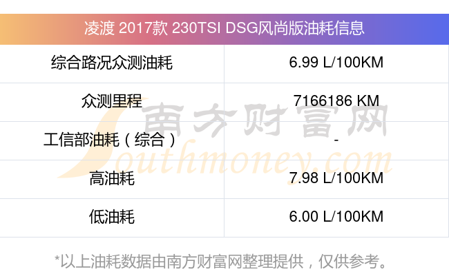 根據(jù)車主實測數(shù)據(jù),該車型低油耗為6.00L/100km,高油耗為7.98L/100km,綜合路況眾測油耗為6.99L/100km,工信部綜合油耗為-L/100km。